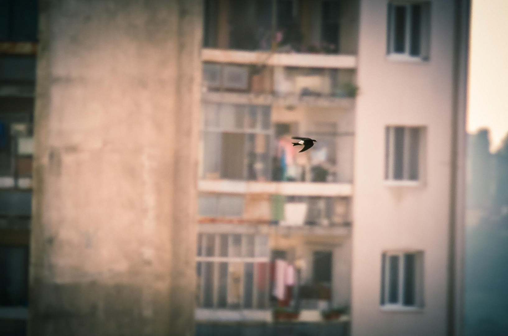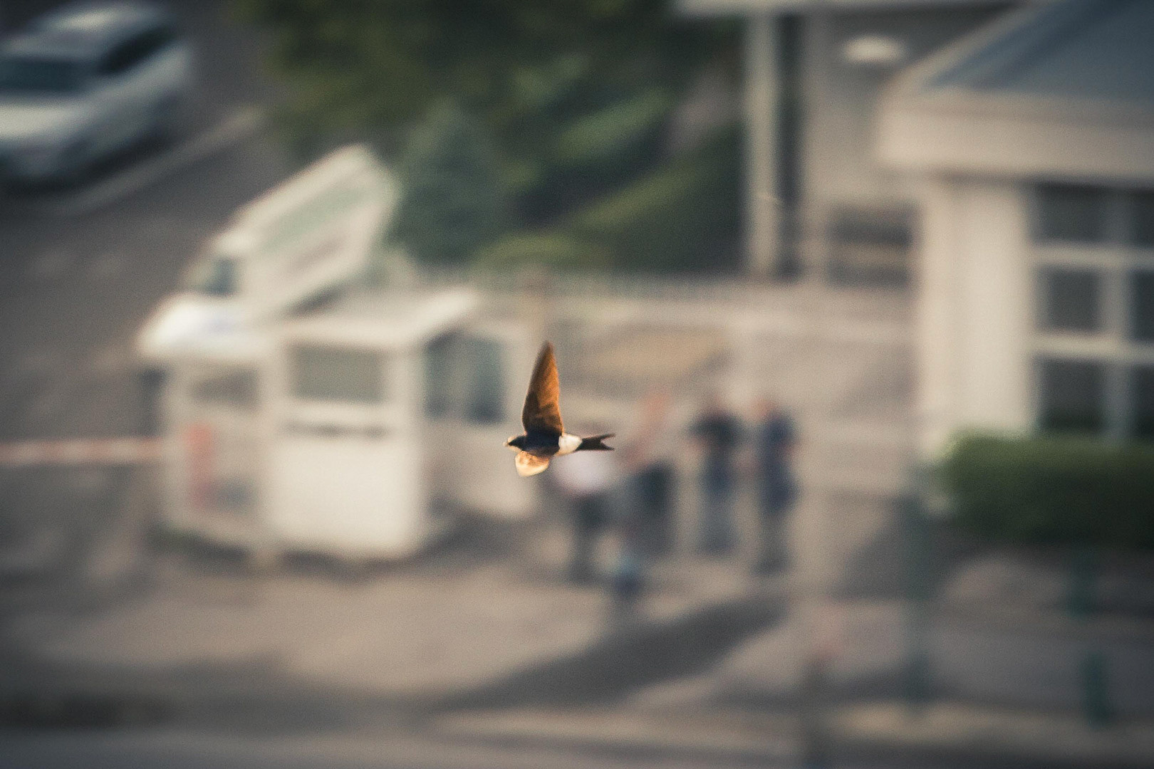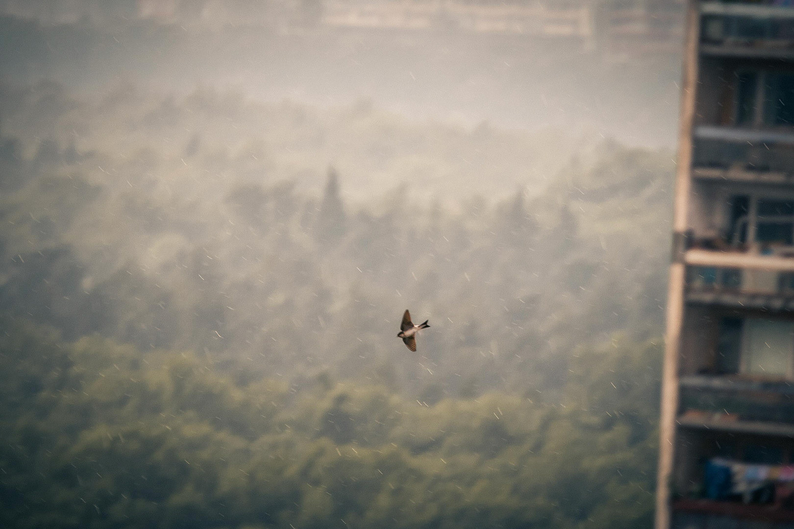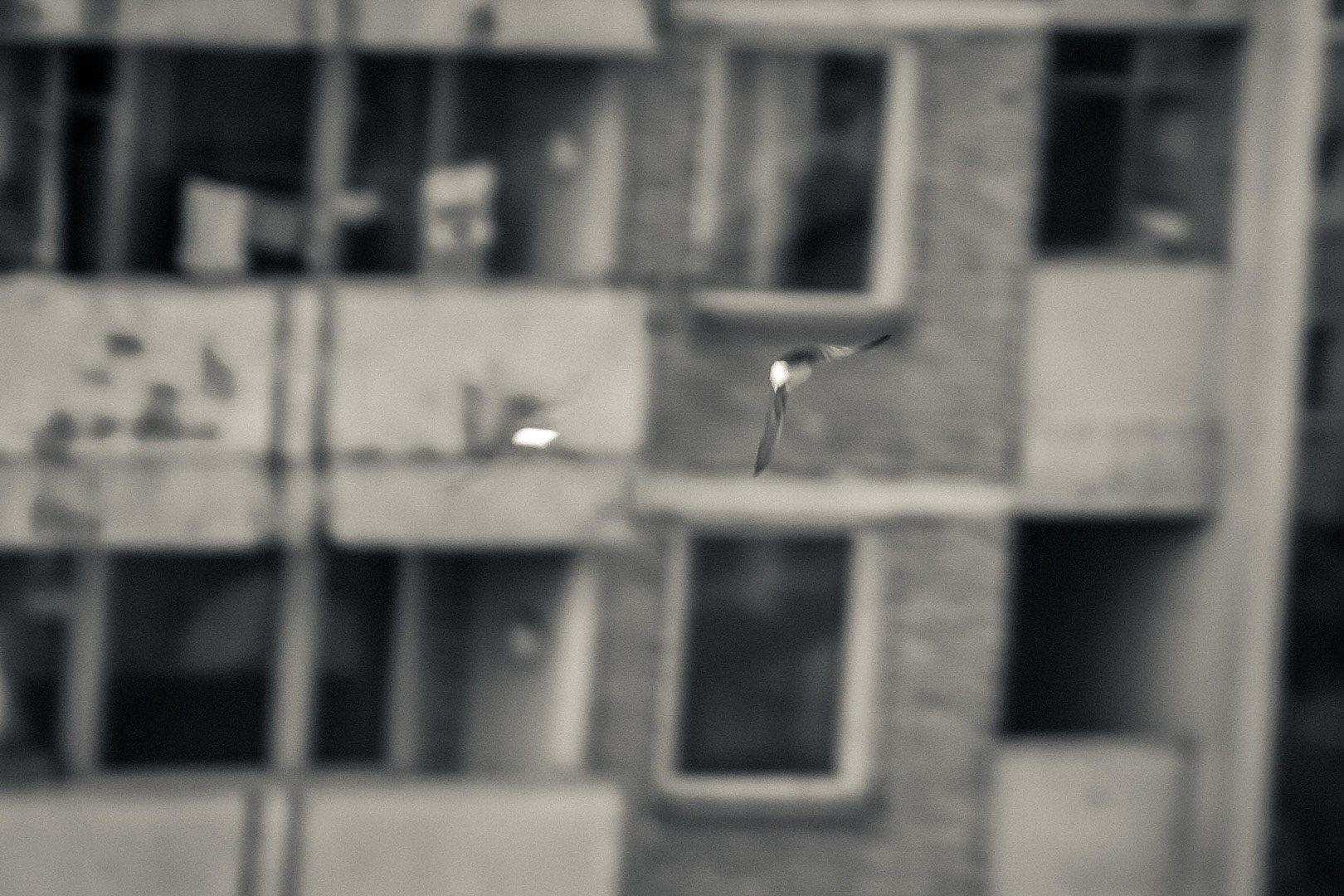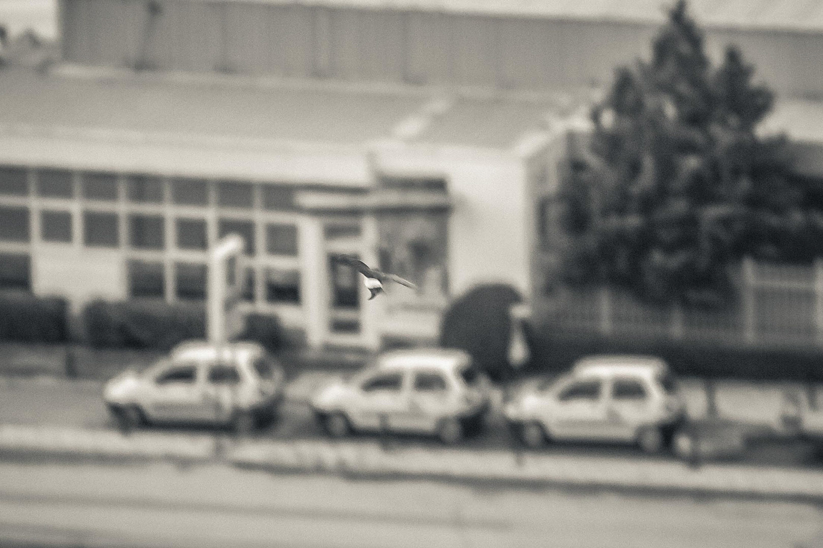 Take the sparrow for example - it's unimaginable to take a shot of it in free flight. It flies like a little ball of feathers, bouncing up and down in such an unpredictable fashion, that the best attempts at catching it can't match even a photo as bad as the one bellow* :